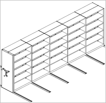 На рисунке 1 мы видим пять отдельных передвижных стеллажей, каждый из которых представляет собой двухстороннюю секцию. Каждый стеллаж оснащен приводом со штурвалом, лицевой стенкой, закрывающей детали привода. Эти узлы составляют значительную долю стоимости мобильного стеллажа.